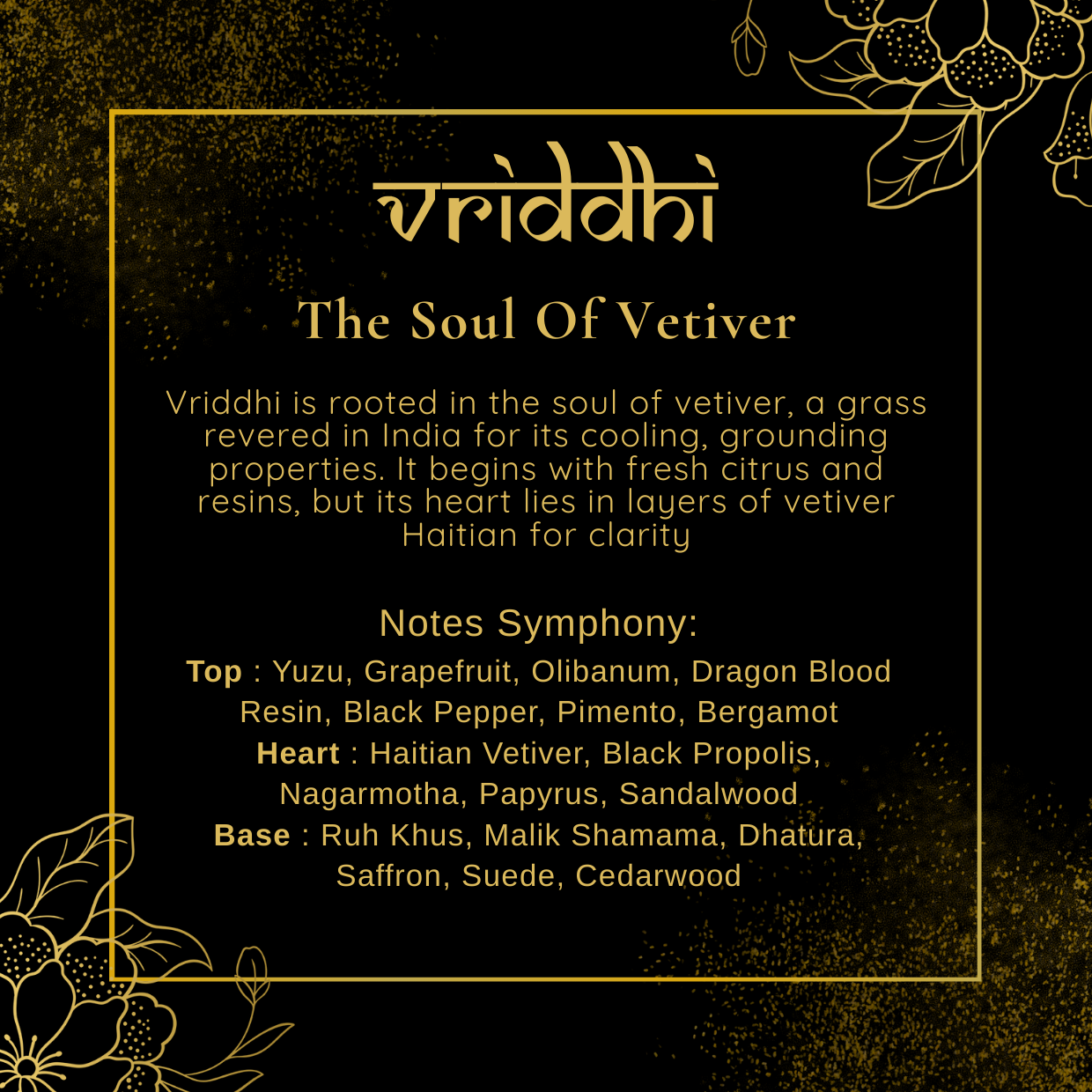 Vriddhi is vetiver reimagined—a fragrance that grows over time like vines across old stone… fresh at first, then deep, sacred, and alive with quiet power.